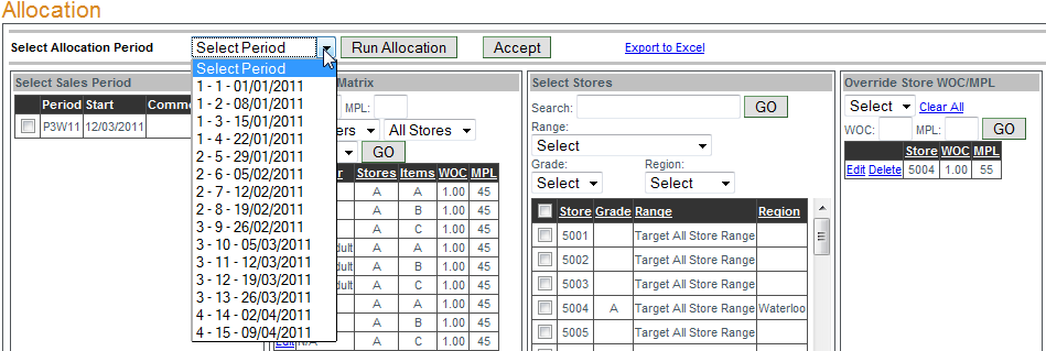 Once the sales period and store(s) have been selected (as well as any overrides or matrix data if any) click "Run Allocation". A list of items will be displayed showing sales data, inventory data and the allocation for each item. When all items and allocation quantities have been reviewed then click "Accept" to confirm this allocation. To edit the sales period, WOC or WPL for an item click
