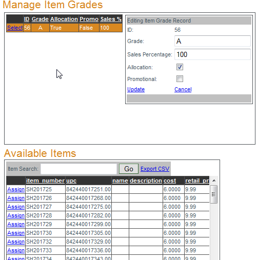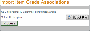 The list must be in a properly formatted CSV file, format = 2 columns of data: ItemNumber, Grade (in that order). Once the list is processed the items imported will be displayed in the Assigned Grade Items box for that grade.