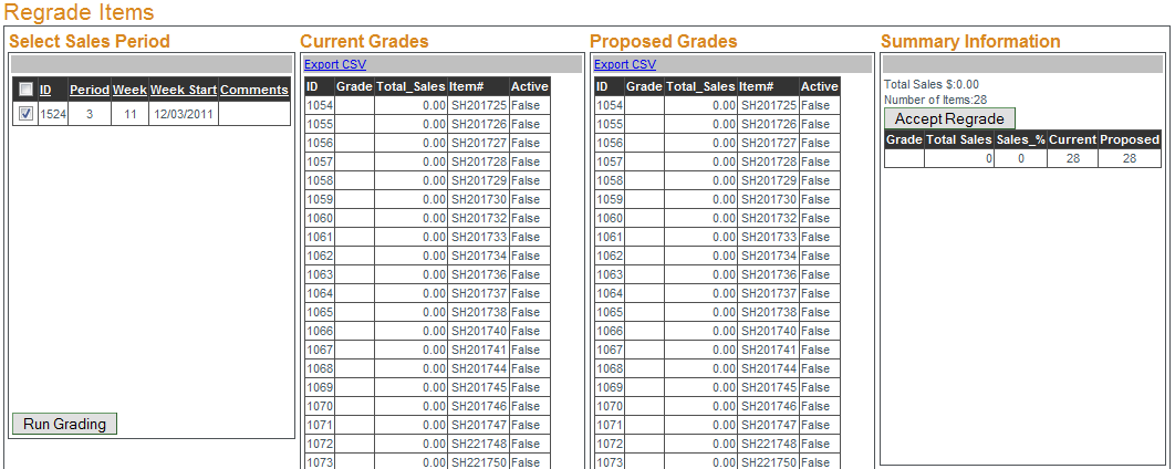 To regrade items select a sales period and click "Run Grading". If there items available for regrading their current grade and sales information will be displayed in the Current Grades box along with the proposed, new grade for the item based on sales performance. Review the items available for regrading and click "Accept Regrade" to confirm.