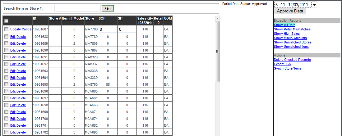 Show Unmatched Stores: This report shows any records containing a store number that does not match the store numbers associated with a retailer.