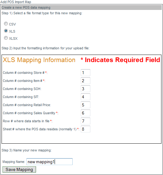 EXAMPLE: if your POS data file lists the item# first then put a '1' next to 'Column containing Item#, if the imported file lists the item# third then place a 3 next to the item# column). Please note there are 5 fields where a number is mandatory (marked with a red asterisk). Once the mapping order information has been set, give the mapping a name and click "Save mapping". You may now import POS data to the new mapping.