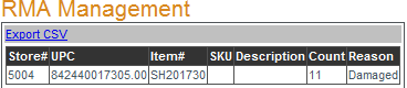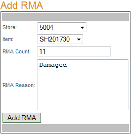 To create an RMA (Return Merchandise Authorization) select the store returning the merchandise and the item number from the corresponding drop-down menus, enter the quantity to be returned, the reason for returning the merchandise and click "Add RMA".