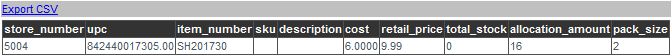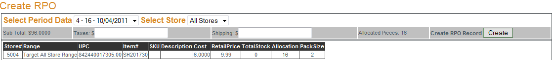 Once allocation has been accepted an RPO (reverse purchase order) can be created. To create an RPO select the period data and the store from the corresponding drop-down menus. If no store is selected the RPO created will include all stores. Allocated items for the period will be displayed in table format with the sub-total cost and total allocated pieces displayed above the table. Enter the taxes applicable for the sub-total amount and the shipping cost and click "Create".