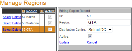 Regions are used to associate Distribution Centres with geographical areas. A store is located in a region, that region is associated with a DC. To manage a region click