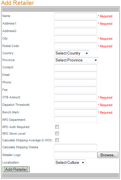 To add a retailer enter all necessary retailer information into the 'Add Retailer' box and click "Add Retailer" to save the new retailer (or