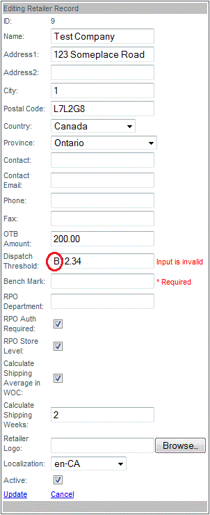 Cancel). NOTE: Name, Address1, City, Postal Code, OTB Amount, Dispatch Threshold and Bench Mark are all required fields. The OTB Amount, Dispatch Threshold and Bench Mark fields will only accept numeric values (see errors in screen shot below).