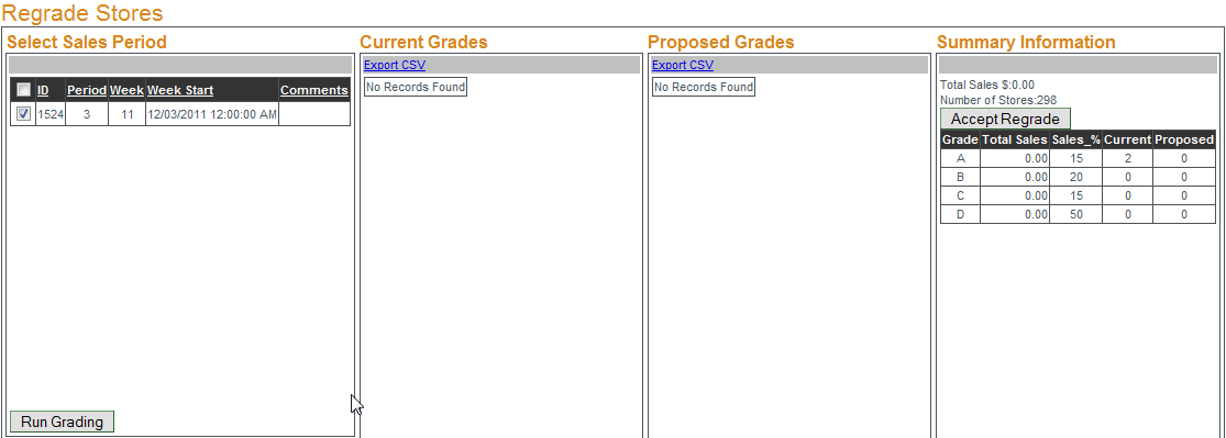 If a store's sales increase or decrease they could move up to a higher grade or fall to a lower one. To determine if any stores are currently performing "outside of their grade" select a sales period to review and click "Run Grading". If a store's sales are at a level of a grade other than its own the current grading information along with the proposed grade will be displayed. To accept the proposed grades click "Accept Regrade".