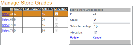 To manage store grades click Select next to the grade to be edited. The grades name, sales percentage and if it is included in allocation can be edited, click